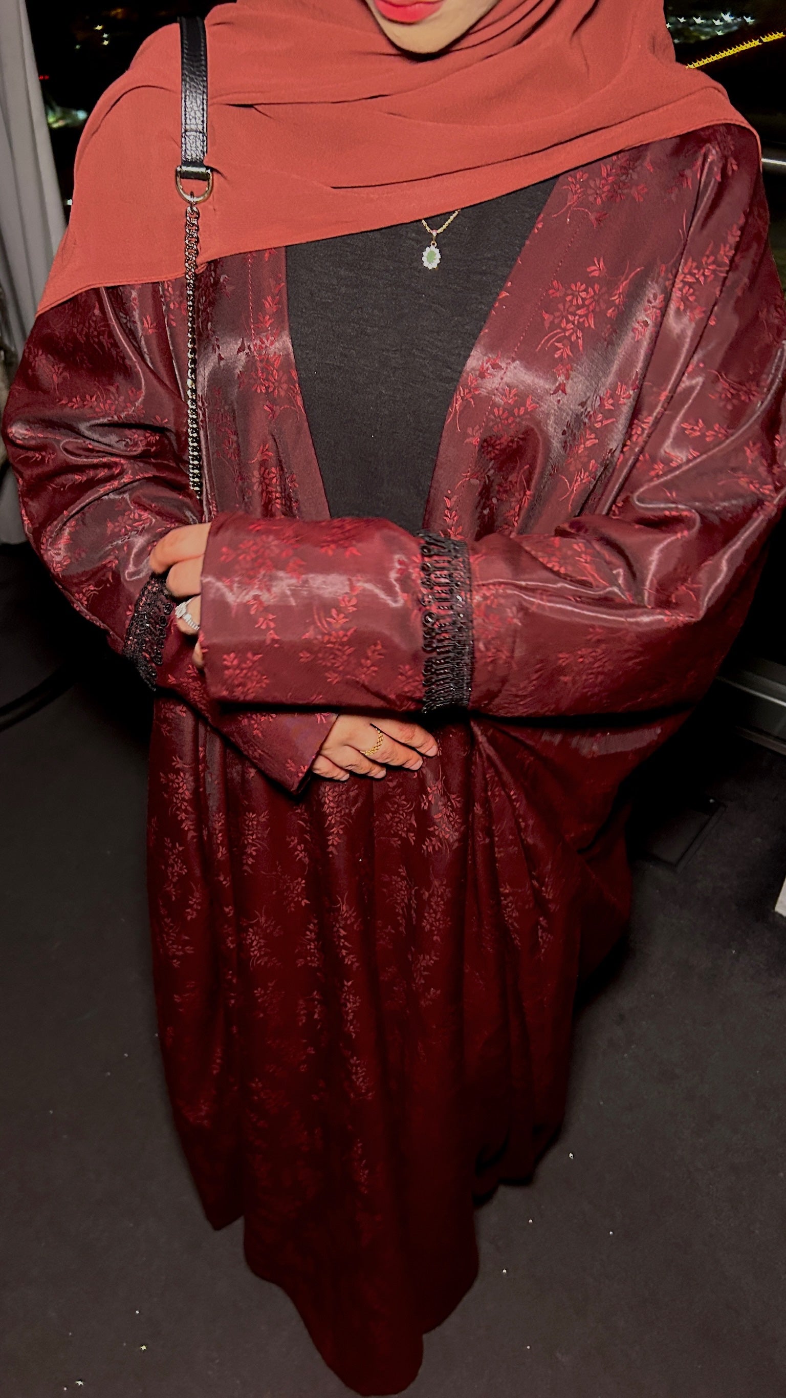 Elevate your wardrobe with the Crimson Elegance Satin Abaya, a timeless piece designed for sophistication and grace. Crafted from rich satin in a deep wine red hue, this abaya features delicate floral jacquard patterns woven into the fabric, adding subtle texture and charm. The glossy finish gives it a luxurious sheen, perfect for evening wear and special occasions.